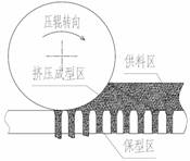 生物质原料主要含有纤维素、半纤维素和木质素等物质,其平模机模辊间的成型机理如下(见图2):供料区内的物料在重力作用下紧贴在平模上,当压辊向前滚动,物料进入变形压紧区,这时因受到挤压,原料粒子不断进入粒子间的空隙内,间隙中的空气被排出,粒子间的相互位置不断更新,粒子间所有较大的空隙逐渐都被能进入的粒子占据。随着压辊继续滚动,被压实的原料进入挤压成型区,部分楔形区、模孔的锥孔部分和前半部分都属于挤压成型区,该区内,压力继续增加,粒子本身发生变形和塑性流动,在垂直于最大主应力的方向被延展,并继续充填周围较小的空隙,由于压辊和物料间的摩擦作用加剧而产生大量热量,导致原料中含有的木质素软化,粘合力增加,软化的木质素和生物质中固有的纤维素联合作用,使生物质逐渐成形,这时部分残余应力贮存于成型块内部,粒子结合牢固但不甚稳定。成型块在挤压作用下进入模孔的保型段,在该段不利于形状保持的残余应力被消除,颗粒被定型。